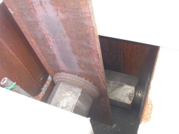 従来工法では公道上での防護柵設置時には、支柱を建てるため杭打ち機で削孔します。 その為、道路のアスファルト、路盤、路床まで削孔しています。そのため防護柵を撤去した時には、支柱を建てていた所は穴が空いているわけです。 その穴の補修のためアスファルトを全てめくり、路盤、路床までやり替える事もありました。しかしKGR工法ではPC版の矩形開口に支柱を建込み、間詰め金物でPC版と固定することにより、PC版の重量で転倒を防止します。 そのため、杭打ち機も不要で防護柵撤去後の補修工事も不要になり、工期とコストの両方が縮減されます。 |